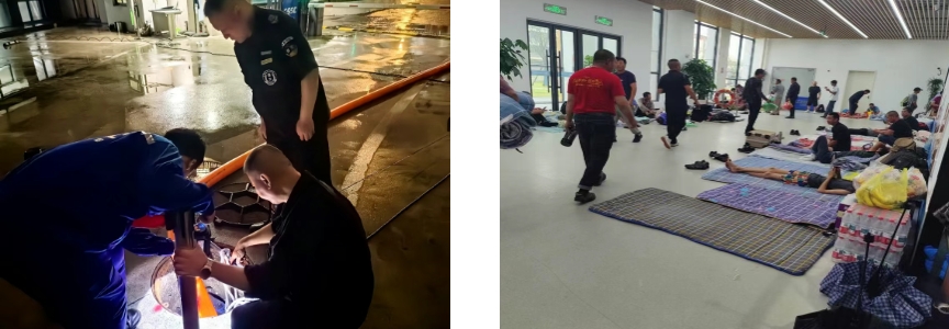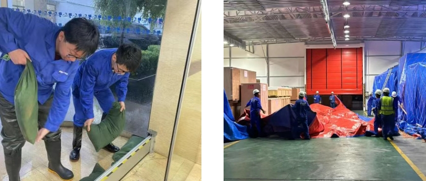 第一時間啟動防汛防臺緊急預案,向全體員工發出動員令。相關部門深入現場檢查設備設施,排除風險隱患。針對低洼易積水區域開展“竹節草”臺風前安全專項檢查,確保室外門能關盡關,同步組織排查所有易松動和易掉落物料的清理;在樓宇門口設置防汛沙袋,做好防水工作;在動力作業區,開展變電站防汛沙袋布置和水位檢查等,確保現場安全。